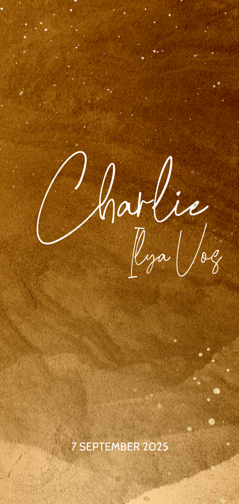 Dit is een prachtig kaartje om de geboorte van jullie dochtertje óf zoontje mee aan te kondigen. De naam in goudfolie en de goudkleurige spetters sluiten mooi aan bij de achtergrond in bruintinten. Pas het kaartje naar eigen wens aan in de online editor en bestel snel een proefdruk om dit kaartje in het echt te bewonderen!