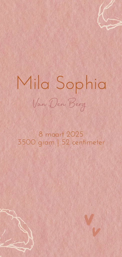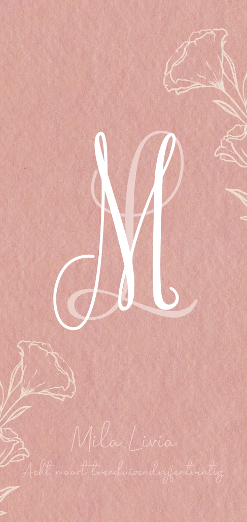 Kondig de geboorte van jullie dochtertje aan met dit lieve kaartje! Centraal op het kaartje staan initialen en aan de zijkanten zijn bloemen geïllustreerd. De combinatie van de roze achtergrond met roségoudfolie is prachtig. Pas het kaartje naar wens aan in onze online editor en bestel snel een proefdruk om dit kaartje in het echt te zien!