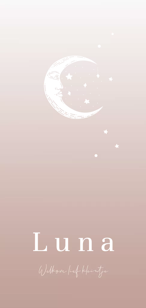 Kondig de geboorte van jullie dochter aan met dit mooie kaartje. Op het kaartje staat een roségoudfolie maan met gezichtje en daar omheen kleine roségoudfolie sterretjes. Pas het kaartje naar wens aan in onze online editor en bestel snel een proefdruk om dit kaartje in het echt te zien!