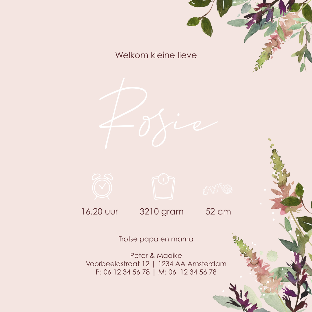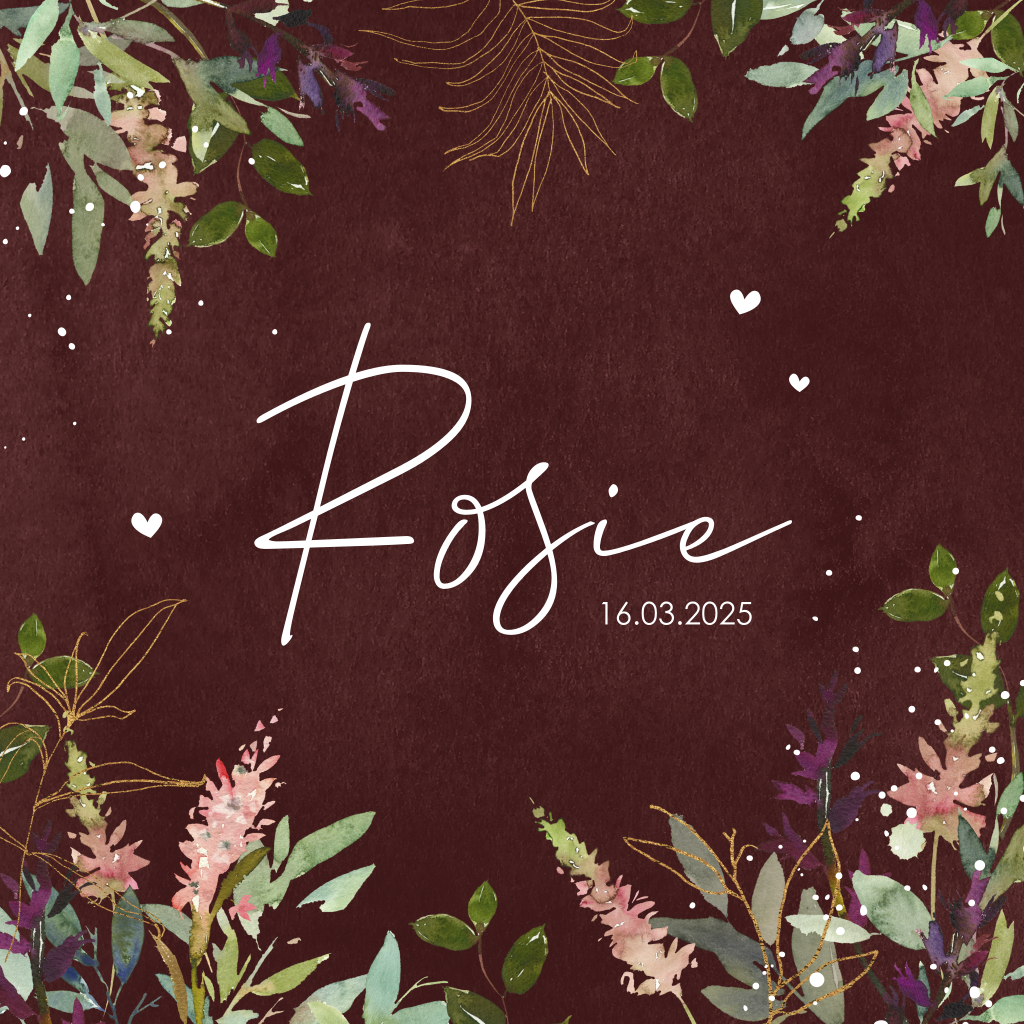 Dit is een sfeervol kaartje voor jullie pasgeboren dochter. Het kaartje heeft een mooie donkerrode velvet-look achtergrond met roségoudfolie opdruk. De kleurrijke illustraties van takjes en bloemen maken dit kaartje helemaal af!