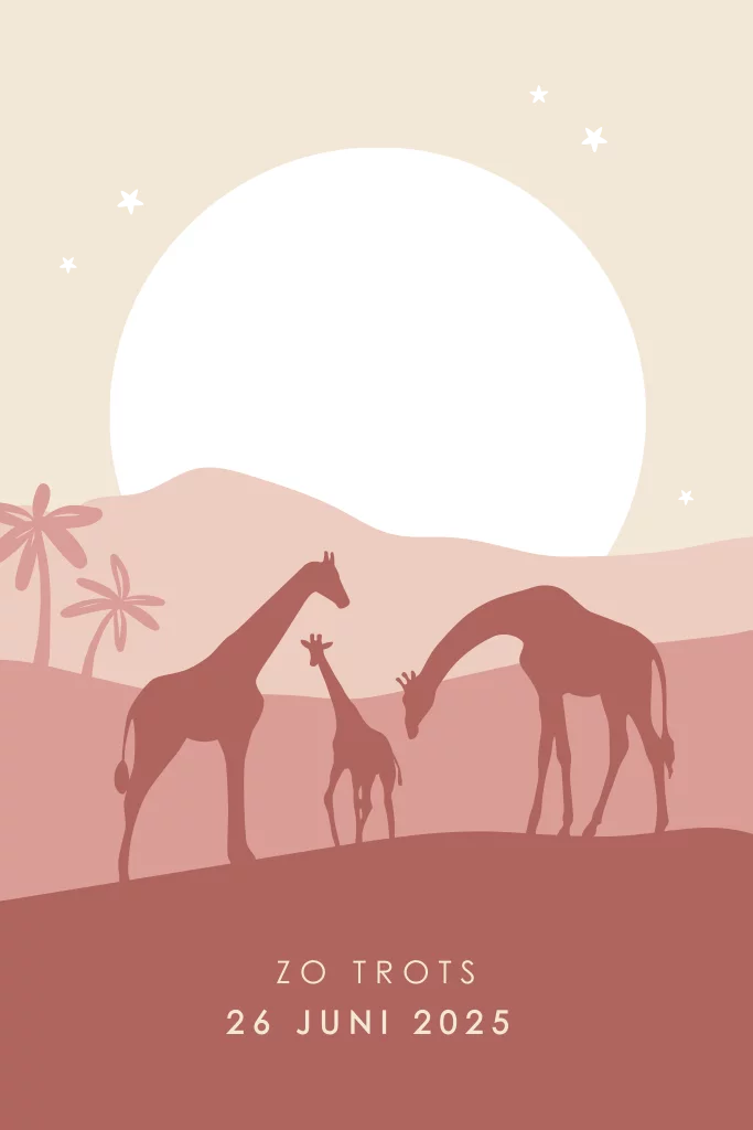 Op dit avontuurlijke geboortekaartje staan de silhouetten van drie giraffen. De naam van je pasgeboren kindje en een aantal sterretjes worden gedrukt in roségoudfolie. Het kaartje is naar eigen smaak te bewerken in de online editor.