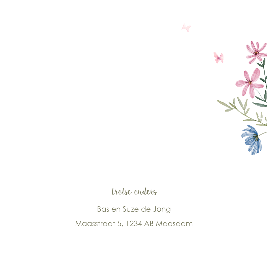 Schattig geboortekaartje met veldbloemen en vlinders. De naam en geboortedatum van je pasgeboren dochter worden gedrukt in goudfolie. Het kaartje kan je naar eigen wens aanpassen in de online editor.