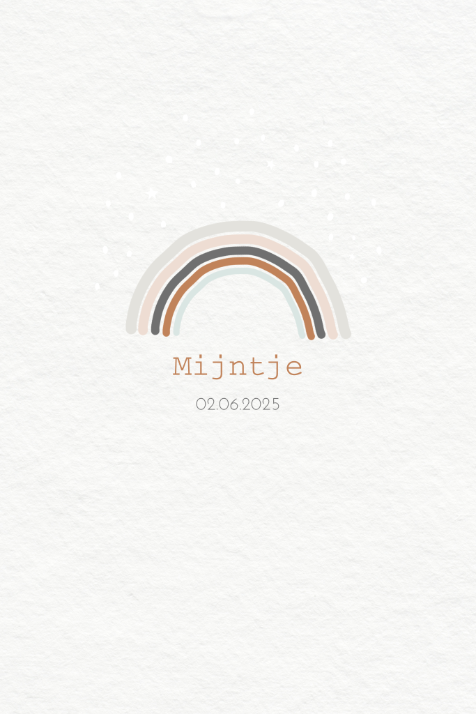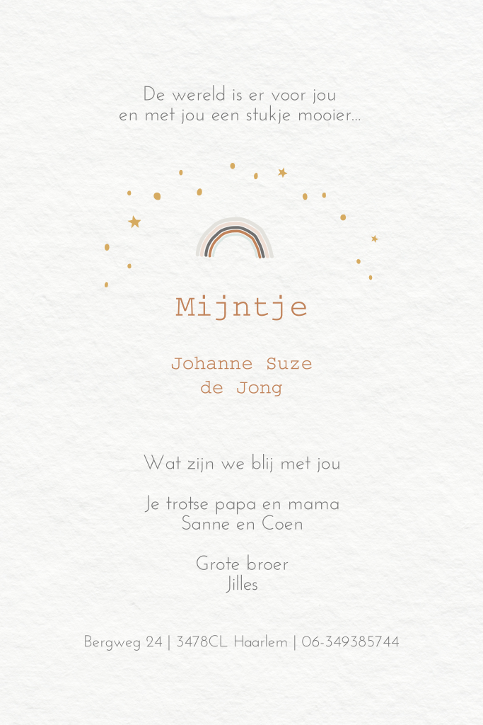 Een regenboog op je geboortekaartje: wat leuk! Ook speciaal zijn de stippen en sterretjes van goudfolie. Leuk voor een dochter! Dit hippe geboortekaartje maak je zelf af met eigen teksten en een bijpassende envelop.
