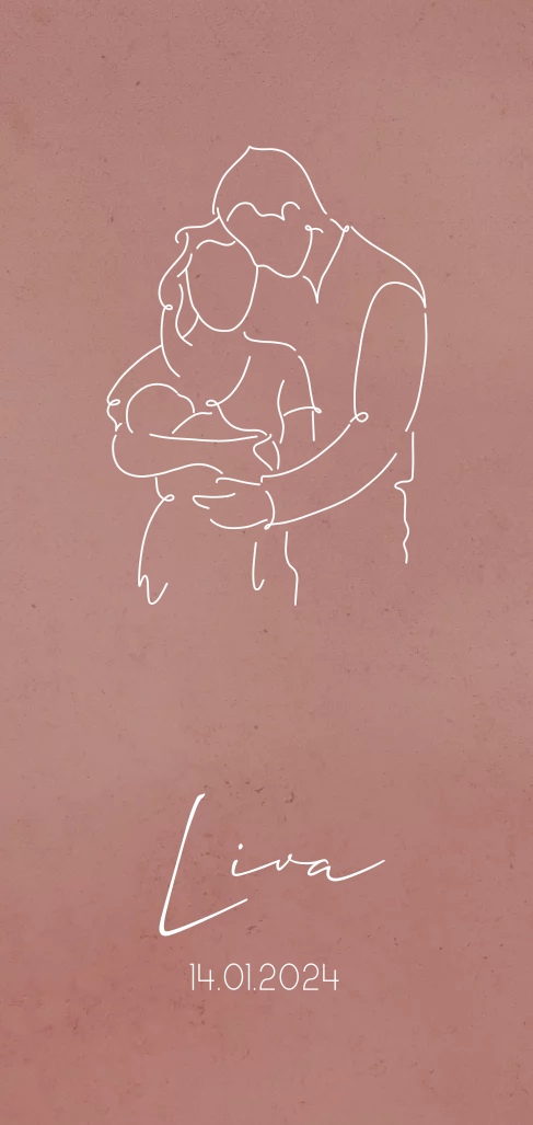 Een lief geboortekaartje voor jullie dochter. Het kaartje heeft een prachtige lijntekening van jullie als gezin gedrukt in roségoudfolie. De achtergrond van het kaartje heeft een mooie roze structuur.