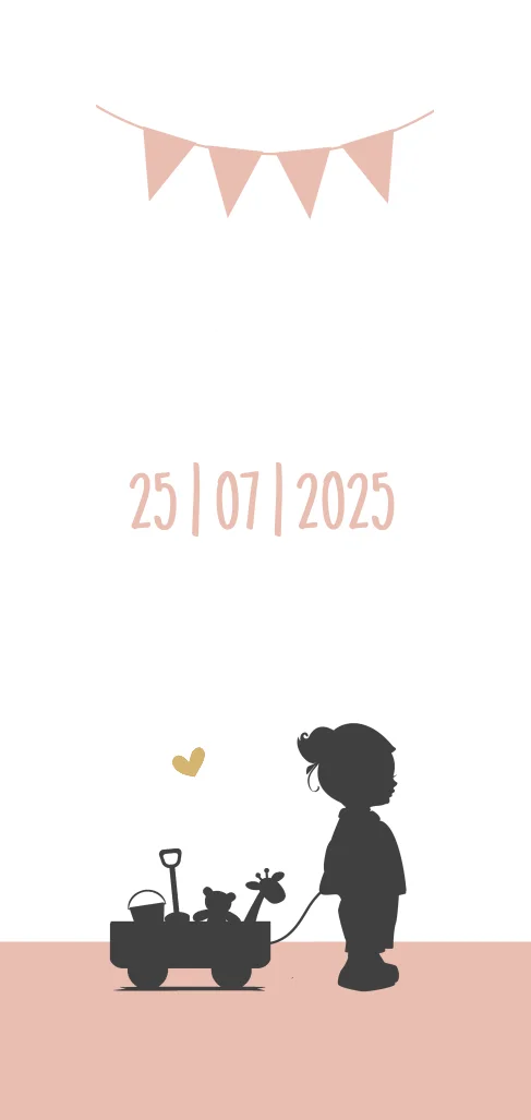 Wat een lief babykaartje met een silhouet van een klein meisje met speelgoed in haar karretje. Ook leuk zijn de feestelijke vlaggetjes! De teksten worden gedrukt in luxe goudfolie, echt trendy! Maak jij dit kaartje zelf af?