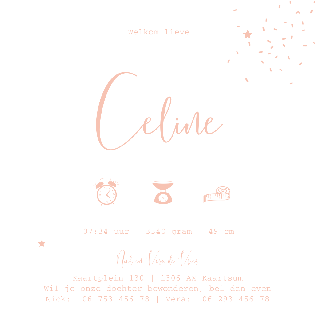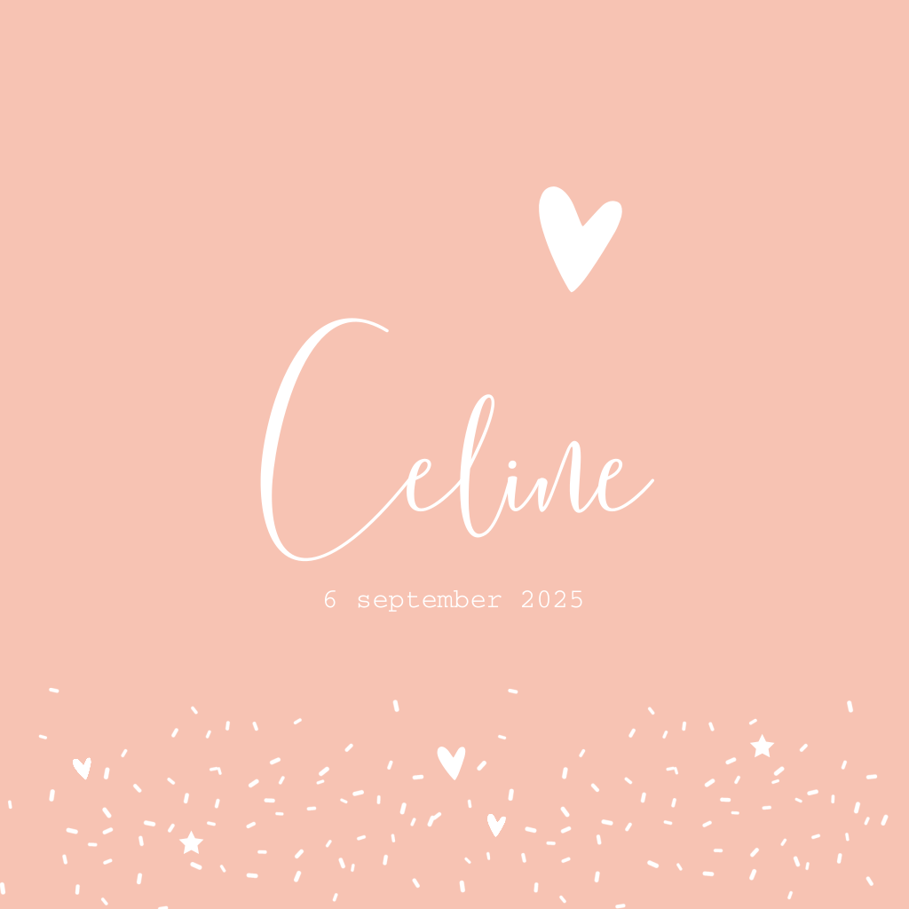 Wat een lief geboortekaartje met allemaal hartjes en speelse streepjes op een roze achtergrond! Leuk voor een meisje. Tof is ook dat sommige elementen worden gedrukt in trendy goudfolie! Maak dit kaartje compleet met eigen teksten in het lettertype naar wens.