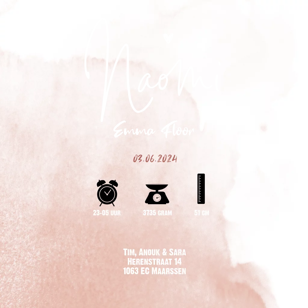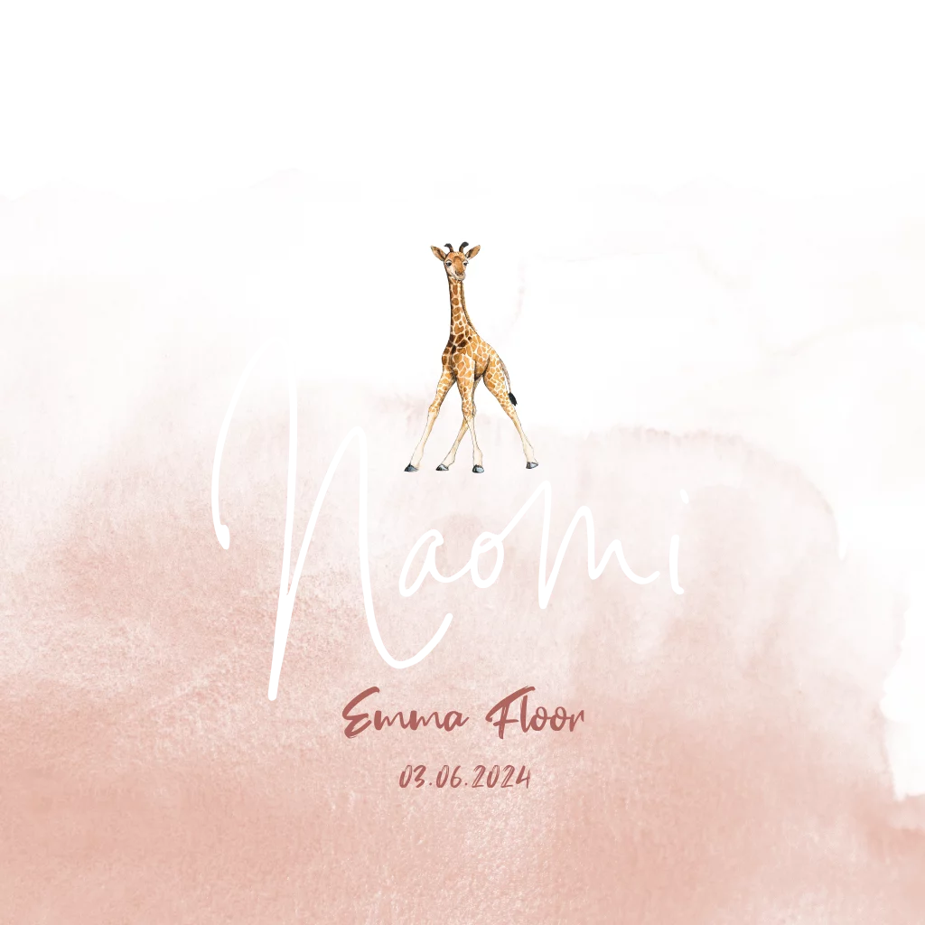 Lieve giraf met aquarel geschilderd. Maak er, met de juiste kleuren en lettertypes, je eigen ontwerp van. De naam van jullie dochter wordt gedrukt in echt goudfolie. Dit zorgt voor een luxe afwerking.