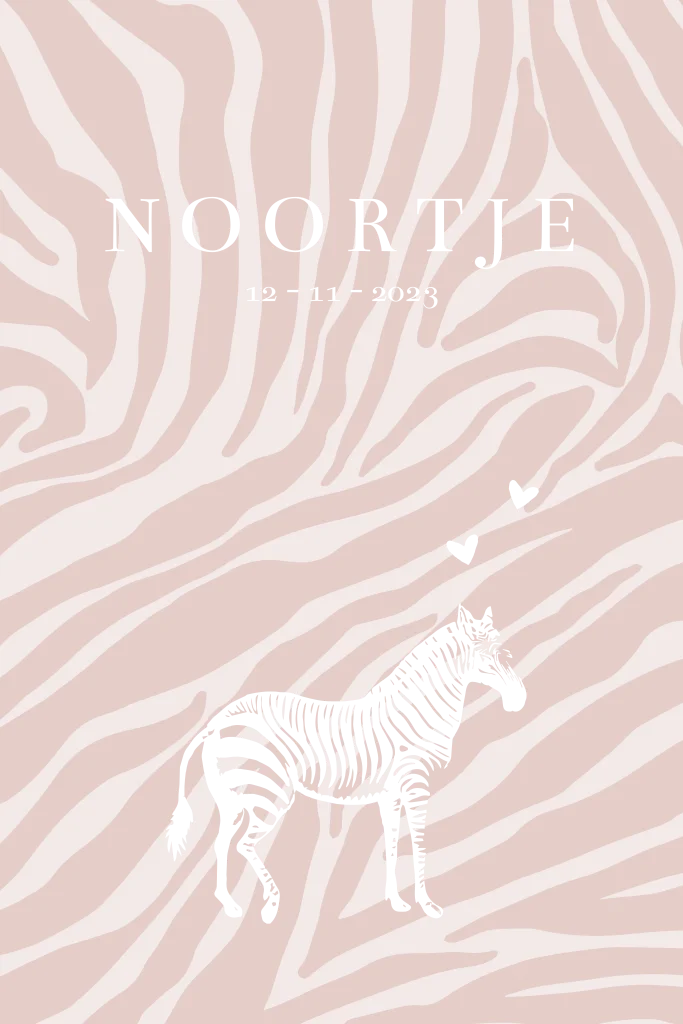 Een schattig kaartje voor de geboorte van jullie dochtertje. Op de achtergrond is een roze zebraprint te zien. Op de voorgrond staat een zebra in het stijlvolle goudfolie. Ook de naam wordt in goudfolie gedrukt.