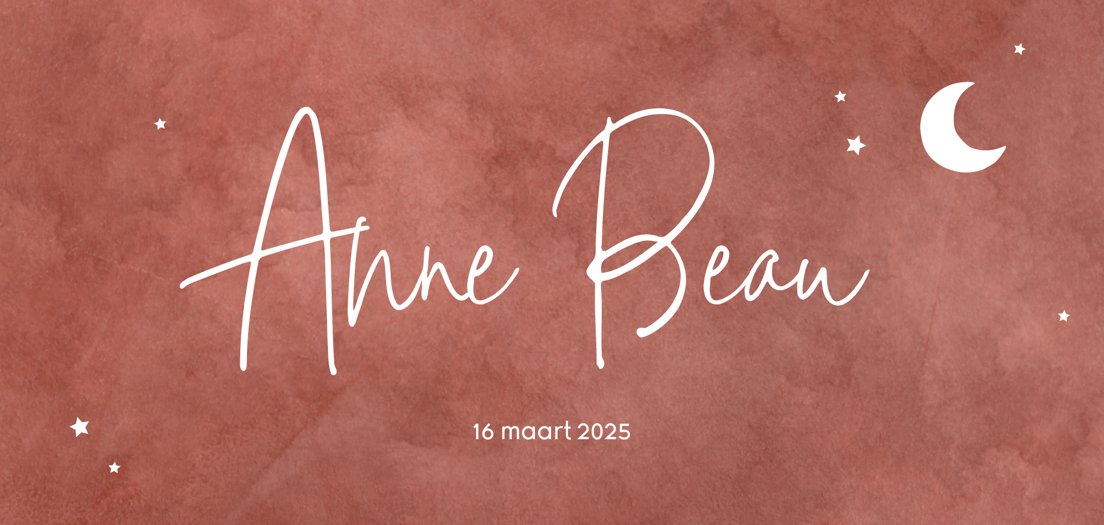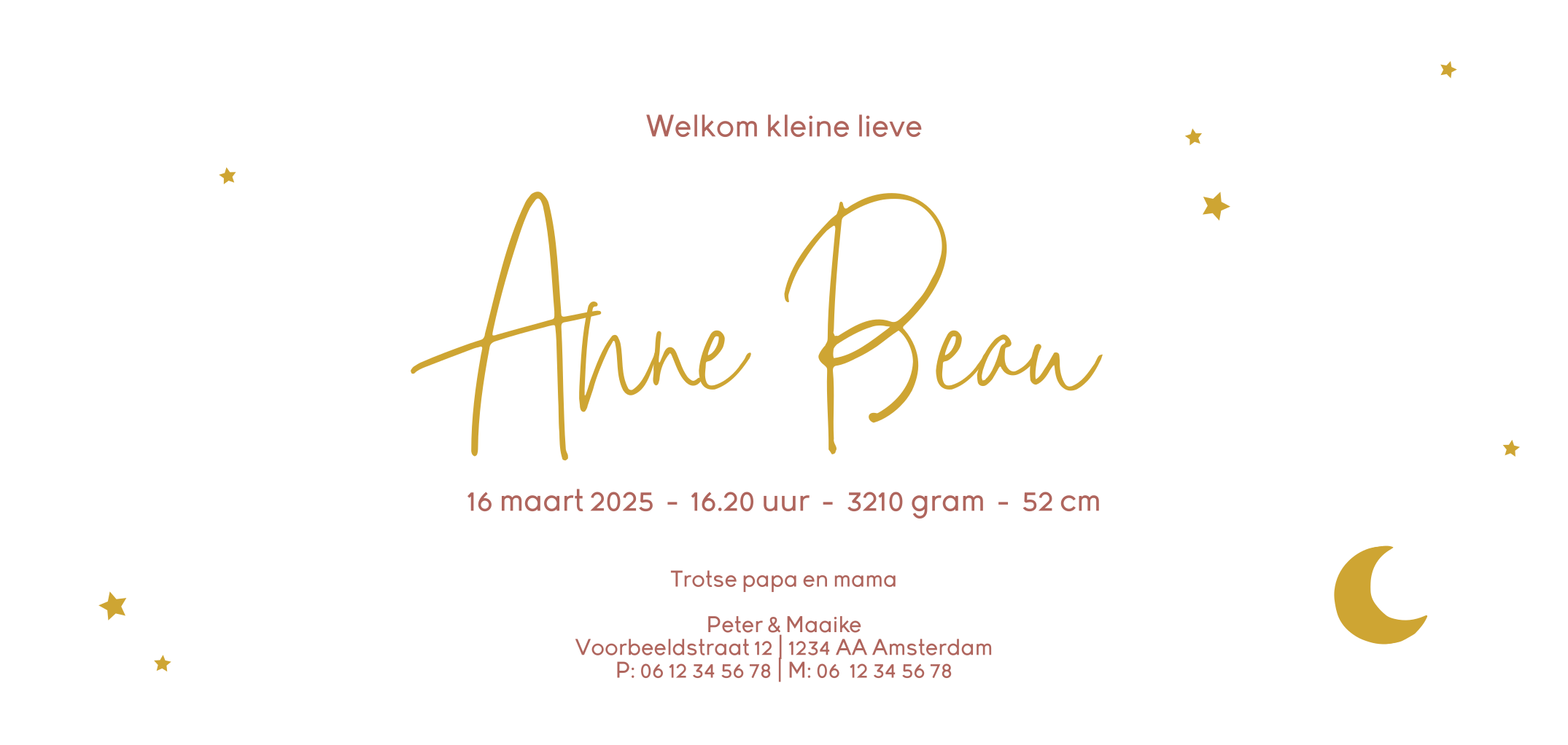 Een ontzettend trendy geboortekaartje voor jullie dochter. De oud roze velvet-look achtergrond staat super mooi met de goudfolie details. De maan rechtsboven is een hip element en ook de sterretjes zijn helemaal van deze tijd.