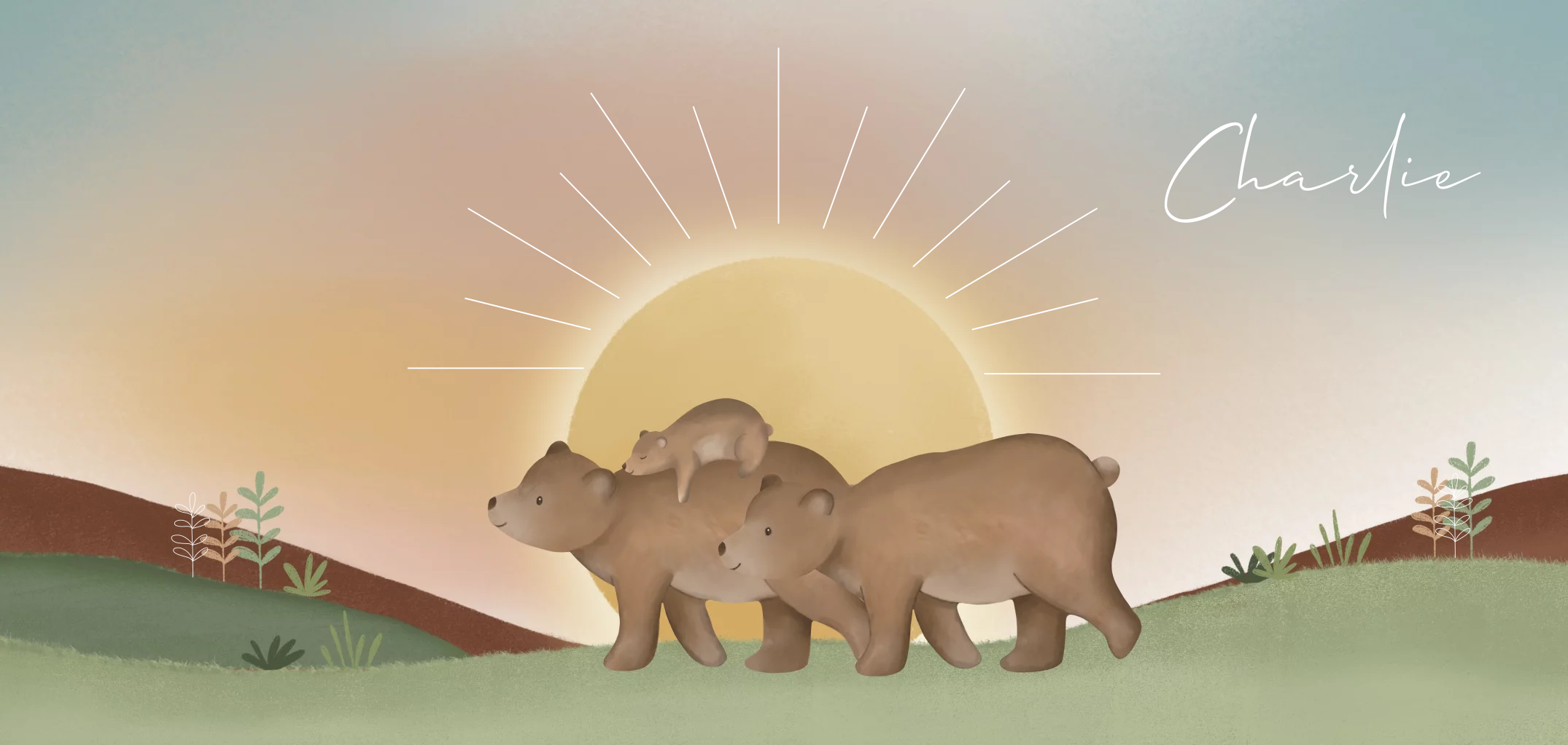 Een illustratie van een lieve beren familie in de natuur. De zonnenstralen op het kaartje zijn gedrukt in goudfolie en laat de zon daarmee echt tot leven komen. Op de rug van de ouder beer zie je een kleine beer. In onze online opmaaktool kan je het kaartje volledig naar wens aanpassen.