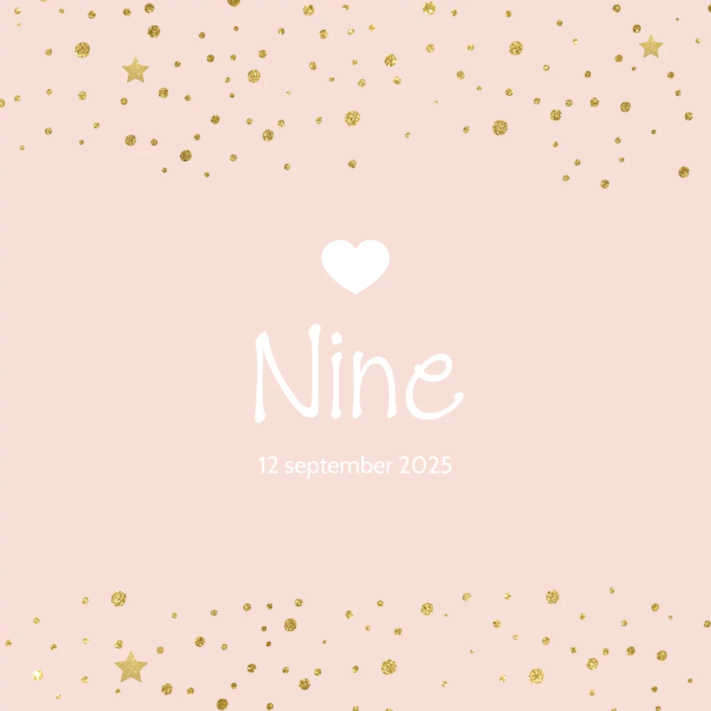 Chique geboortekaartje als geboorteaankondiging voor je dochter met een romantisch goudfolie hartje en goudlook glitter stipjes op een roze achtergrond.
