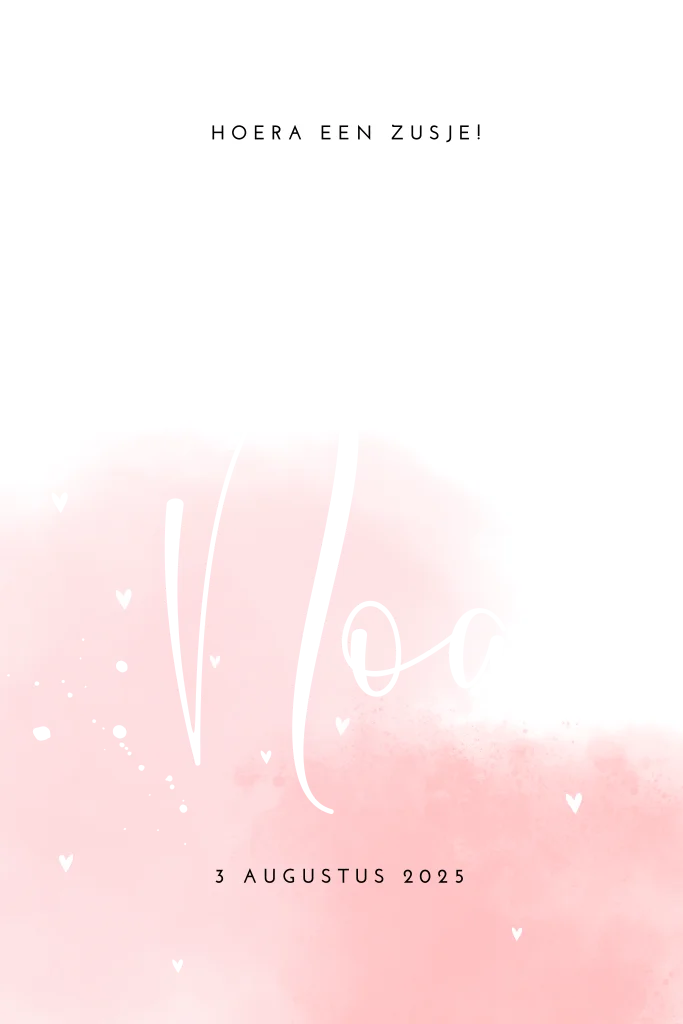 Schattig geboortekaartje meisje met goudfolie babynaam, spetters en hartjes op roze watercolor. Liever een andere kleur waterverf? Pas het eenvoudig aan in de online editor!