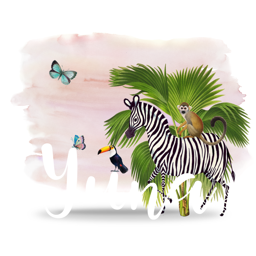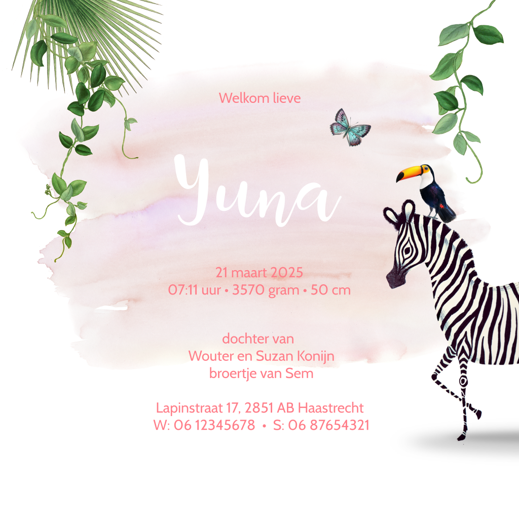 Trendy goudfolie geboortekaartje voor je dochtertje met vrolijke illustratie van jungle dieren zoals een toekan, een aapje en een zebra op een roze waterverf achtergrond.