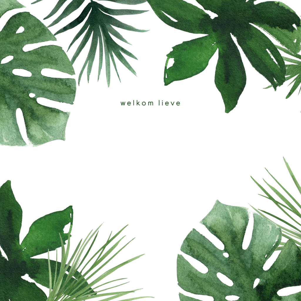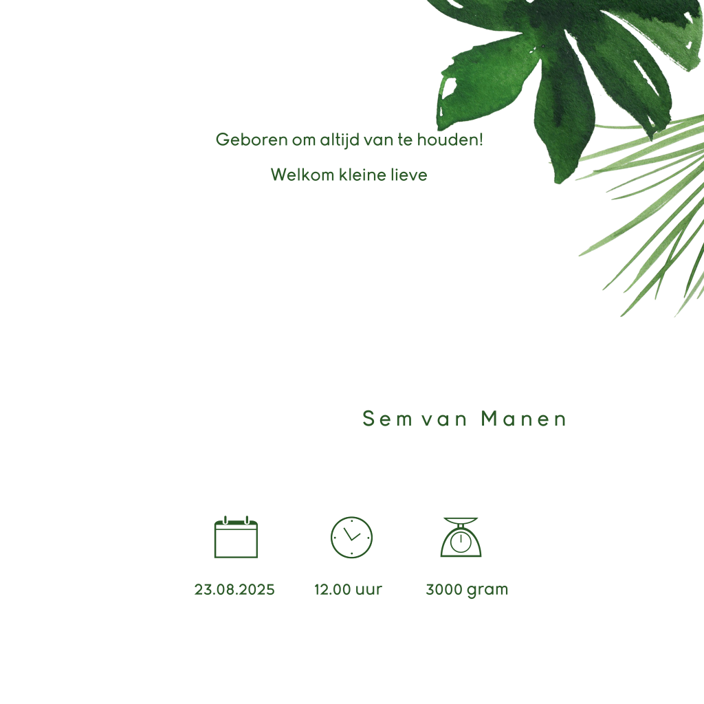 Super hippe geboortekaart voor de geboorte van je zoon of dochter met grote botanische bladeren van watercolor. De babynaam wordt in goudfolie gedrukt en springt er zo echt uit!