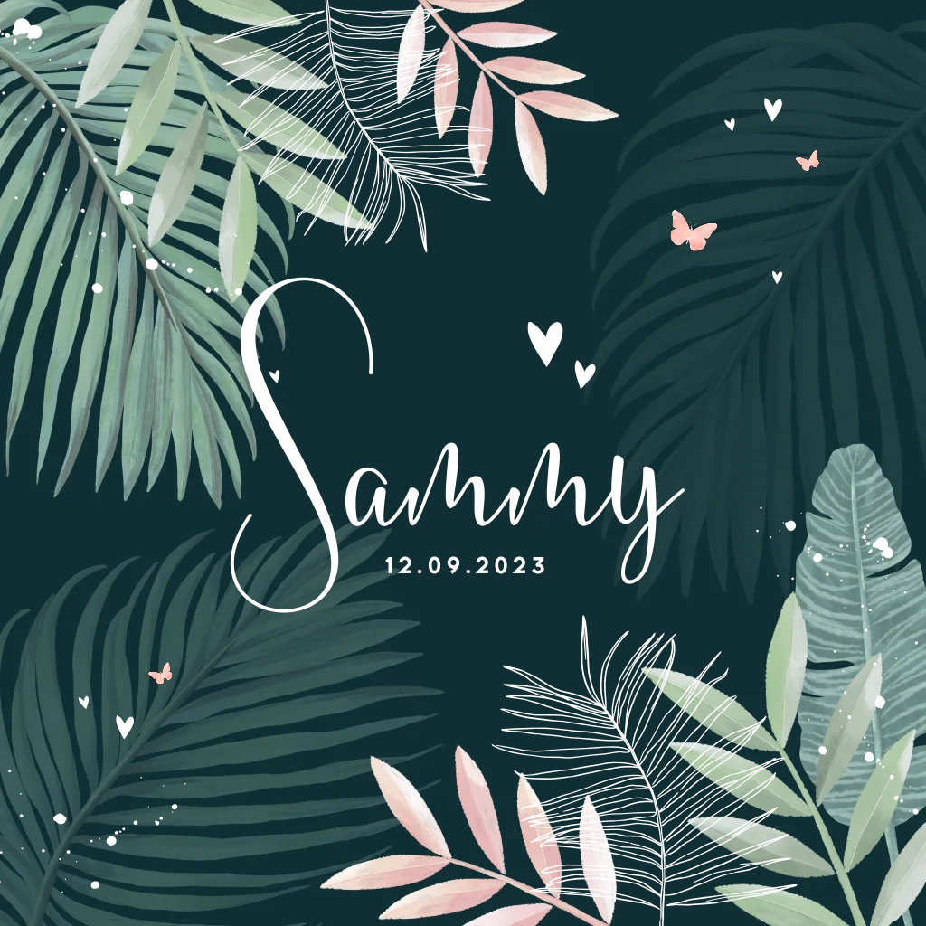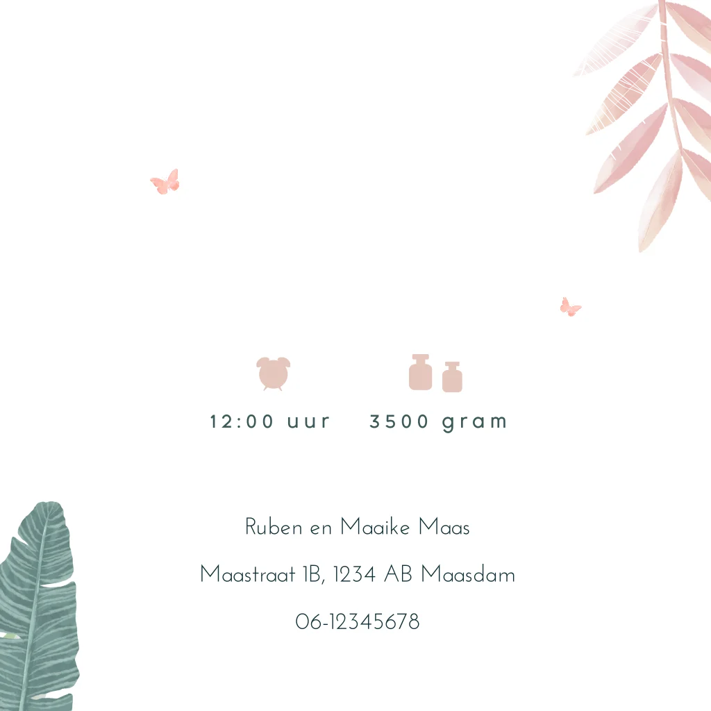 Goudfolie geboortekaartje met botanische bladeren in groen en roze