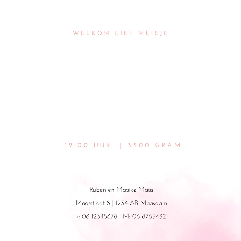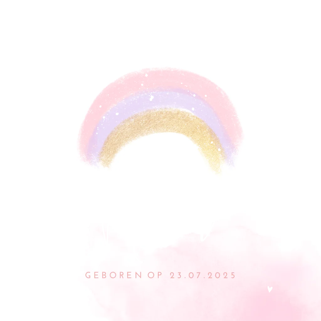 Romantisch geboortekaartje voor je pasgeboren dochtertje met een schattige regenboog en roze waterverf is dit kaartje echt lief! De babynaam, kleine hartjes en verf spetters worden gedrukt met goudfolie en maken dit echt een uniek geboortekaartje!