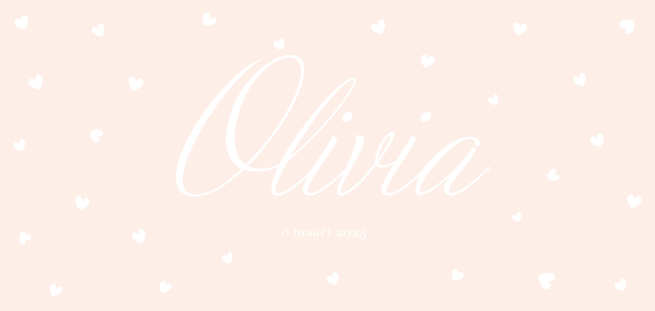 Op dit lieve geboortekaartje staat de naam van jullie dochter in sierlijke letters in goudfolie. Daaromheen regent het kleine, gouden hartjes. Je kunt de roze achtergrondkleur en de kleur van het folie naar wens aanpassen in de online editor.