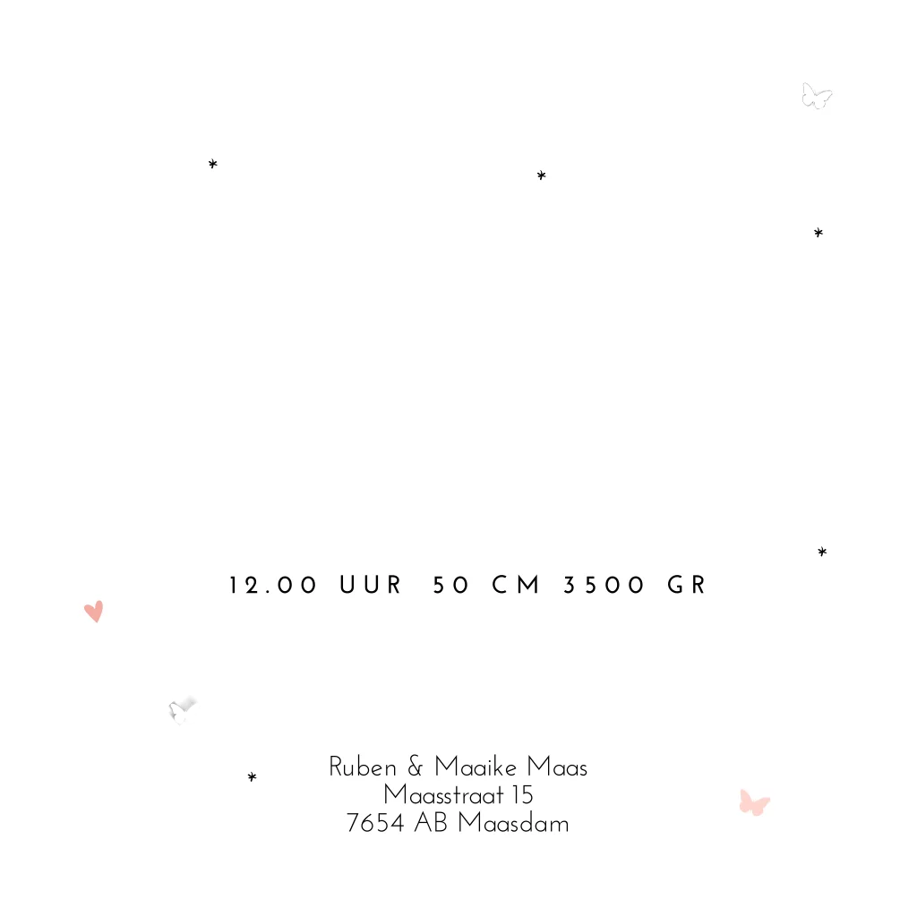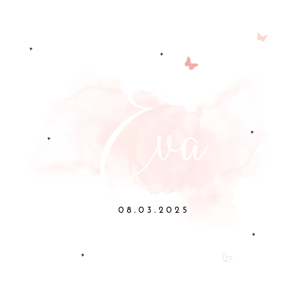 Schattige geboortekaart voor je pasgeboren dochter met de babynaam, vlindertjes en hartjes in goudfolie. De roze aquarel verf en zwarte sterretjes maken dit kaartje helemaal af! Plaats een mooie foto van je dochtertje in de binnenkant en verstuur deze kaart naar je vrienden en familie!