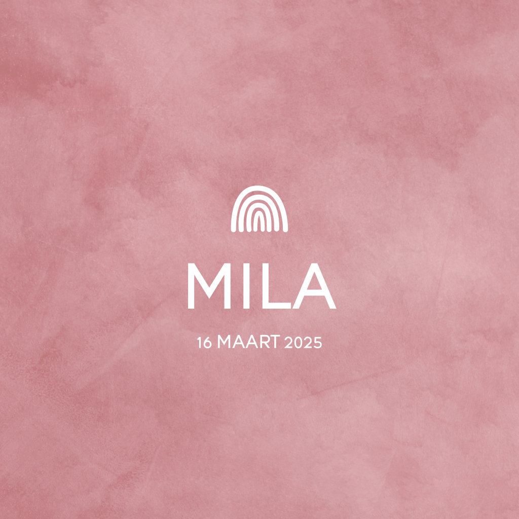 Dit kaartje voor jullie pasgeboren dochtertje is zo lief vanwege het regenboogje in goudfolie en de roze velvet-look achtergrond. Ook het krachtige en strakke lettertype van de naam springt eruit.