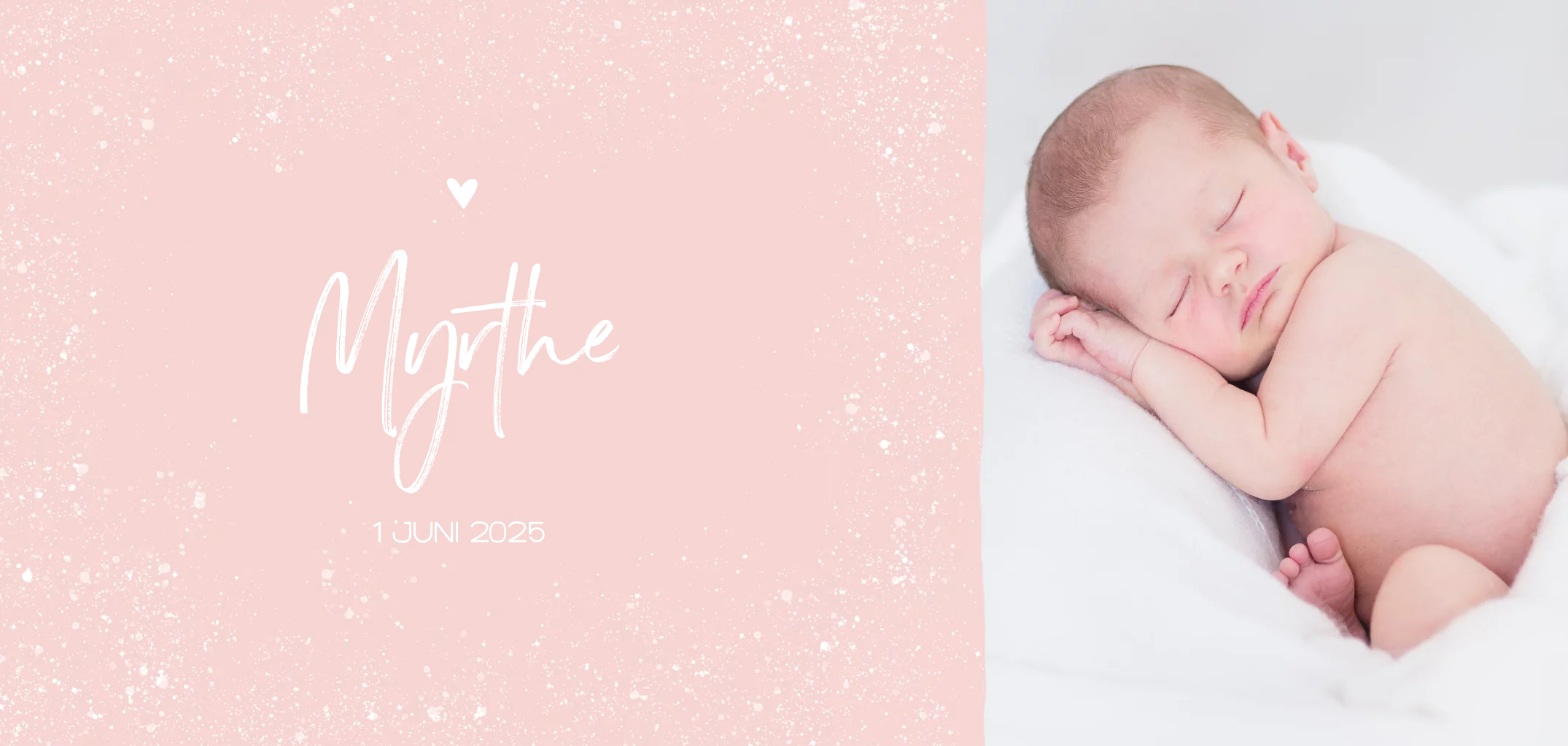 Lieve goudfolie geboortekaart roze met witte verf spettertjes en foto
