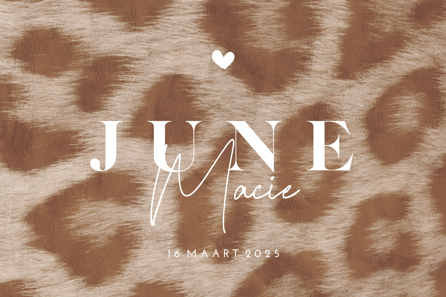 Wat een leuk geboortekaartje voor jullie stoere meid! Het luipaard printje in velvet look geeft het kaartje een stoere uitstraling. De naam is geschreven in trendy typografie. De goudfolie accenten maken het kaartje helemaal af!