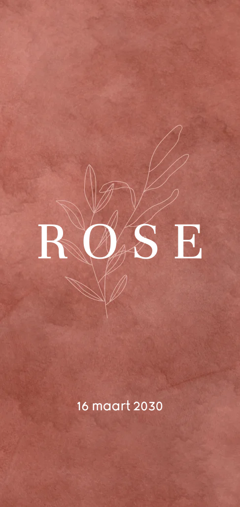 Trendy babykaartje met lijntekening van een takje en de naam van je dochtertje in goudfolie op een achtergrond van terracotta velvet. Pas de teksten eenvoudig aan in de online editor.| Proefdruk | vanaf 2,50 | |||||||||||||||||||||||