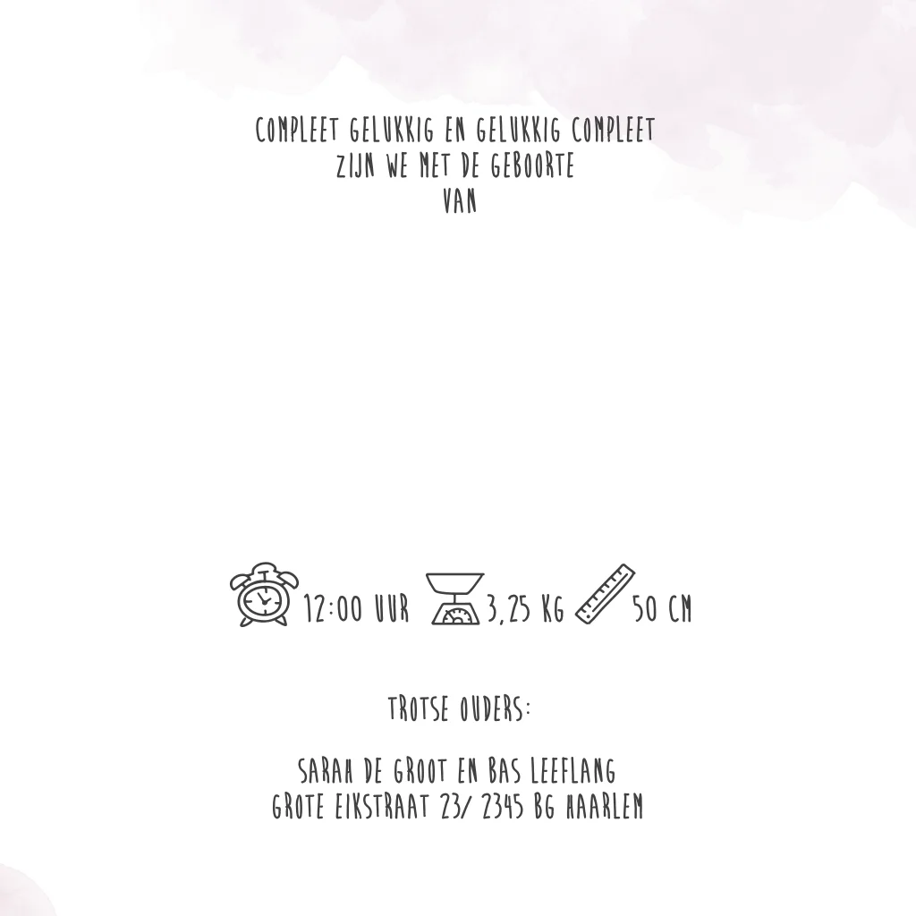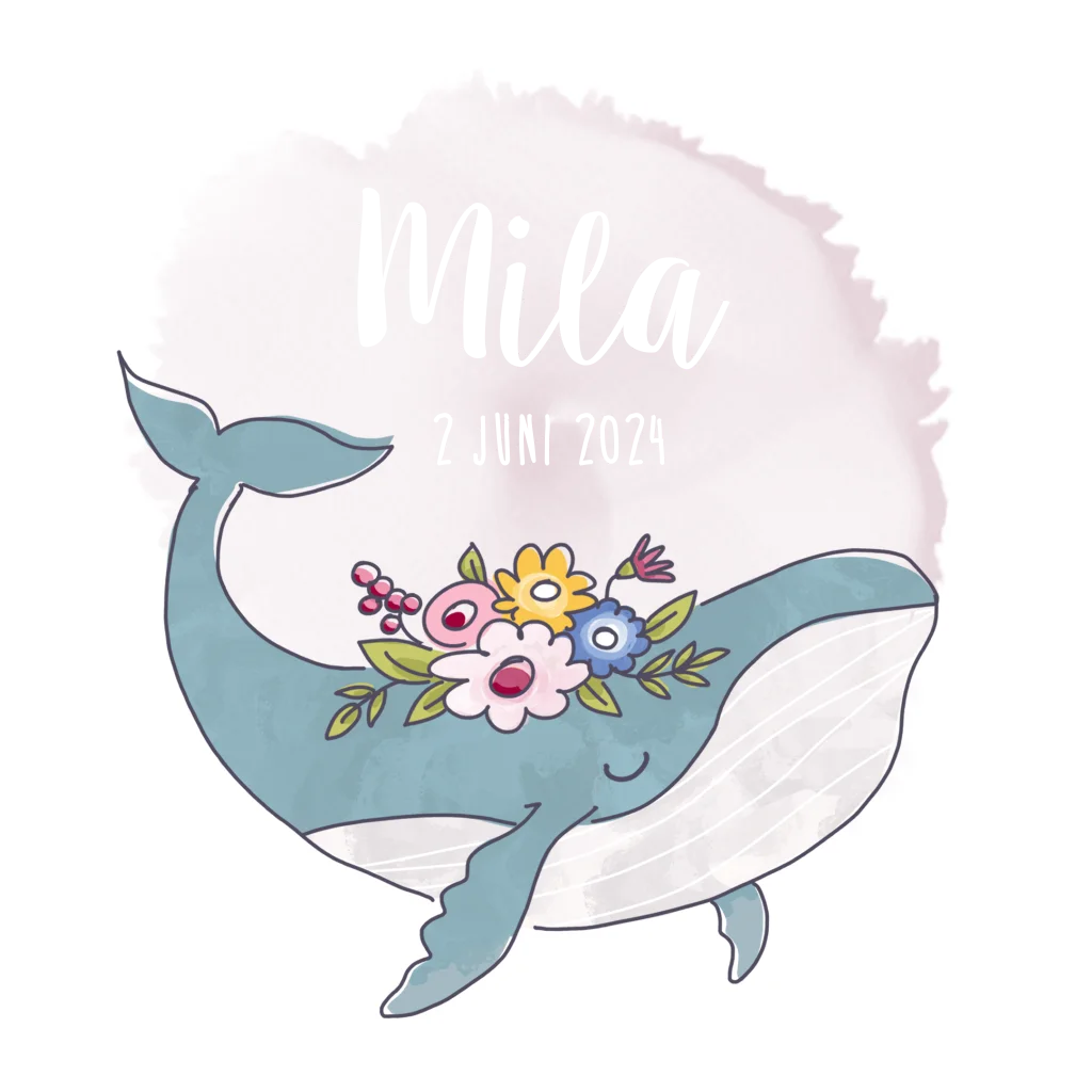 Geboortekaartje met walvis en bloemen op de rug en waterverf
