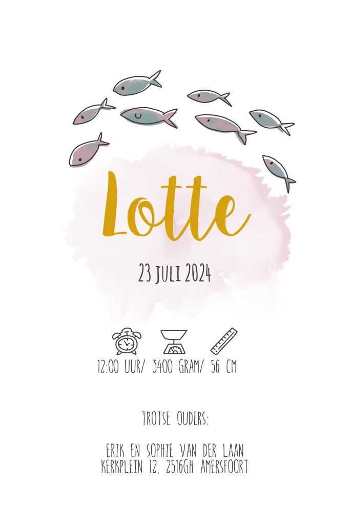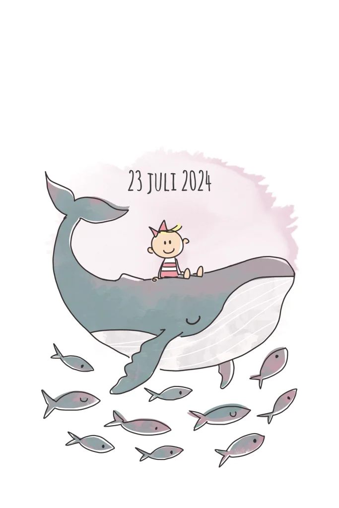 Wat een lief geboortekaartje voor een dochter. Een meisje zit bovenop de rug van een walvis. Een school vissen zwemt mee. Binnenin zwemmen de visjes boven de naam. Met de roze watercolour vlek als achtergrond en de naam in goudfolie is dit kaartje helemaal af.