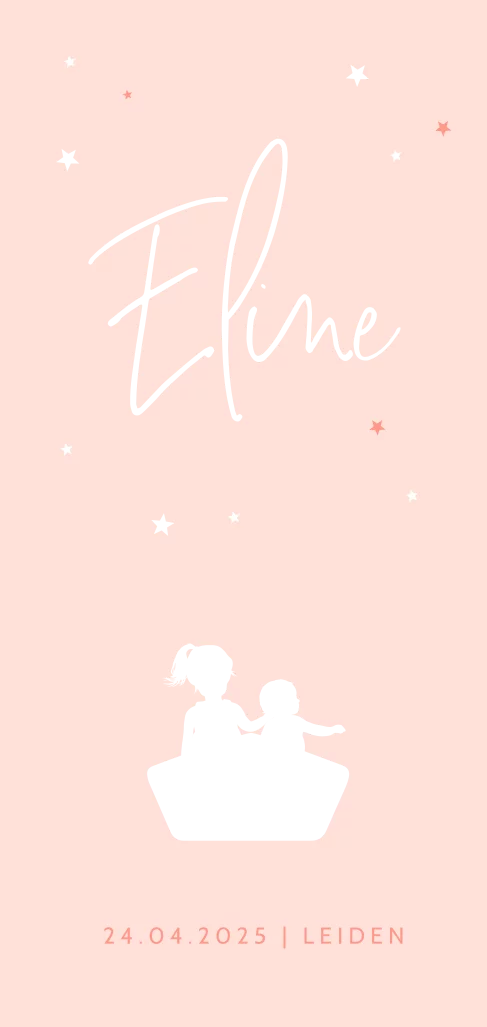 Schattig geboortekaartje met een lief goudfolie silhouet van een babyzusje met haar grote zus samen in een bootje met sterretjes op een roze achtergrond.