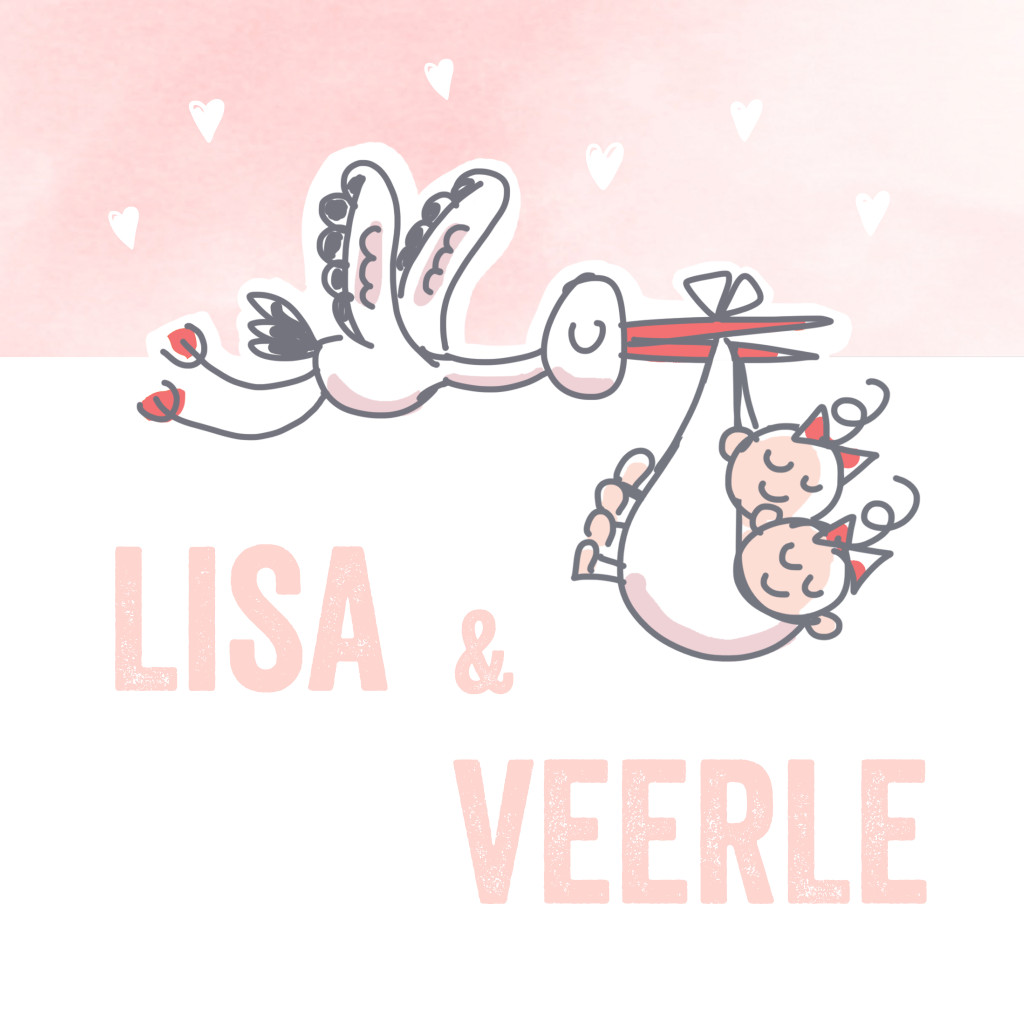 Grappig geboortekaartje voor je pasgeboren tweeling dochters met een illustratie van een ooievaar met twee meisjes. De goudfolie hartjes maken dit vrolijke geboortekaartje helemaal af!