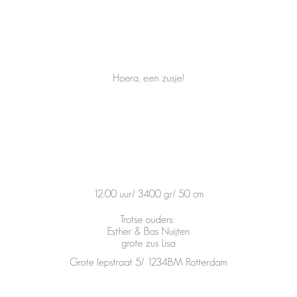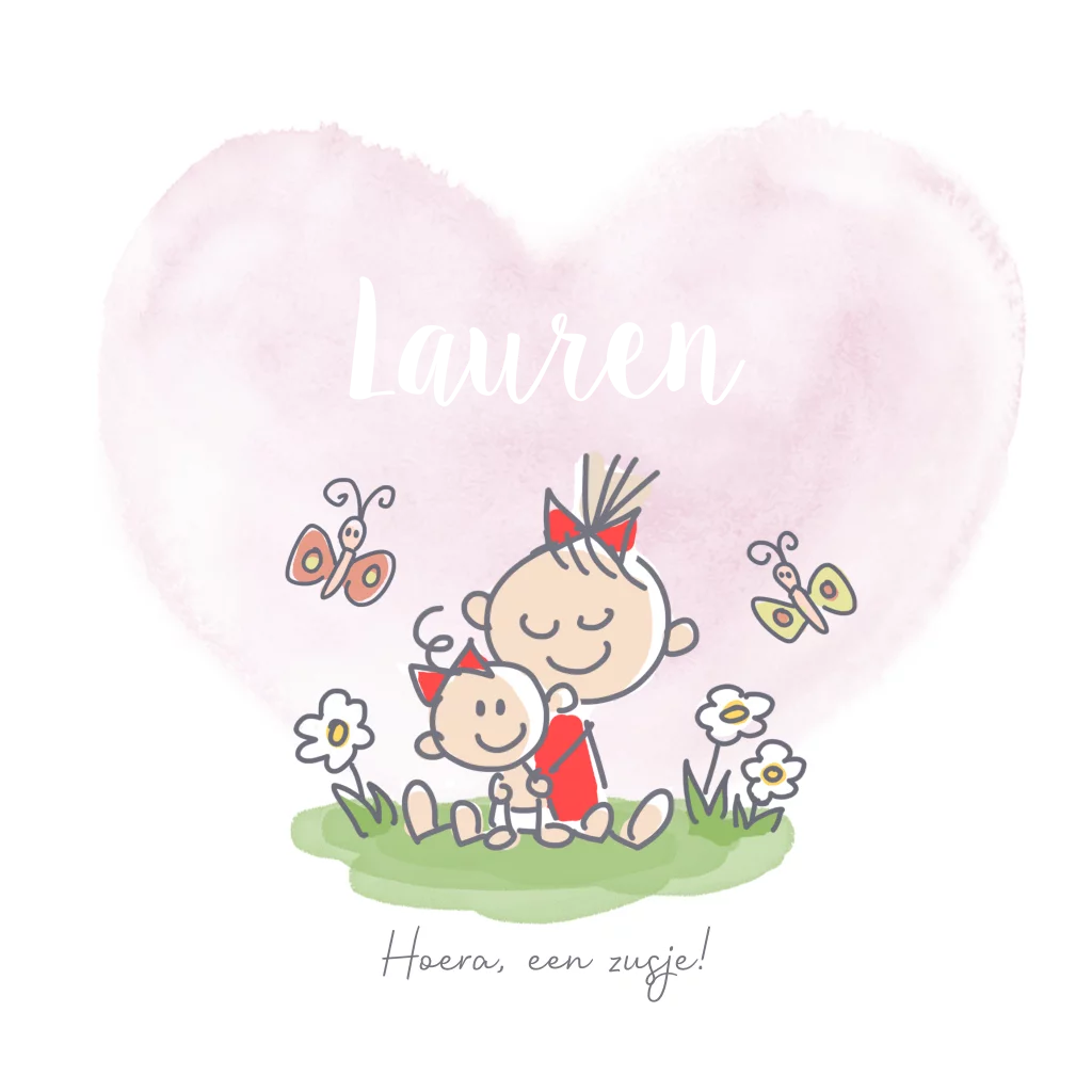 Hoera, een zusje! Dit kaartje is heel toepasselijk wanneer jullie eerste dochter nu een zusje heeft gekregen. Op het kaartje zie je een watercolour hart in de kleur roze. De naam is in glanzend goudfolie gedrukt. Pas het kaartje naar wens aan in onze online editor.