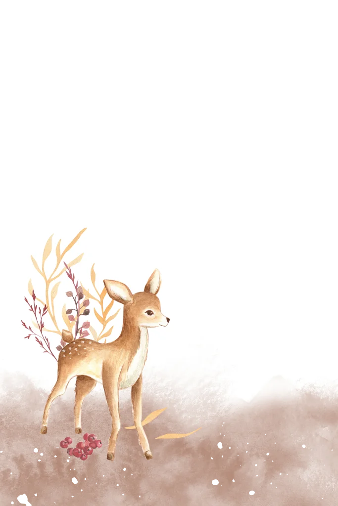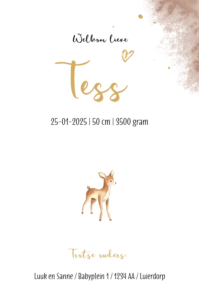 Lief geboortekaartje voor een meisje met hertje en herfst takjes. De naam van jullie kindje wordt gedrukt in echt goudfolie. Dit geeft de kaart een unieke en luxe uitstraling. Ook aan de binnenkant zijn er elementen in goudfolie.