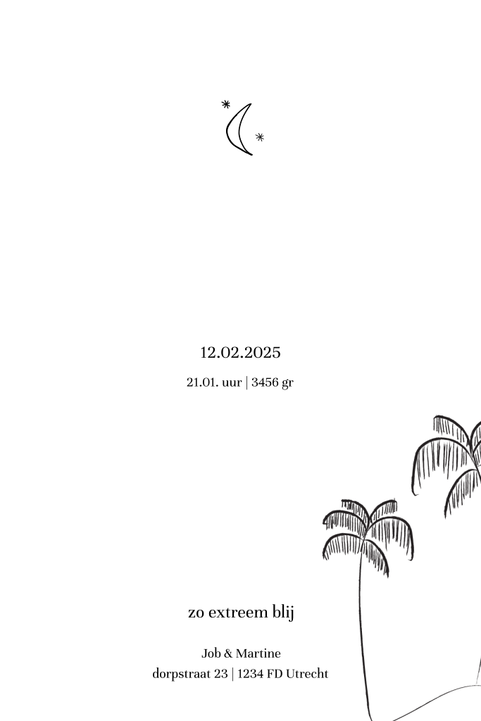 Hip geboortekaartje met illustratie palmbomen en naam in goudfolie