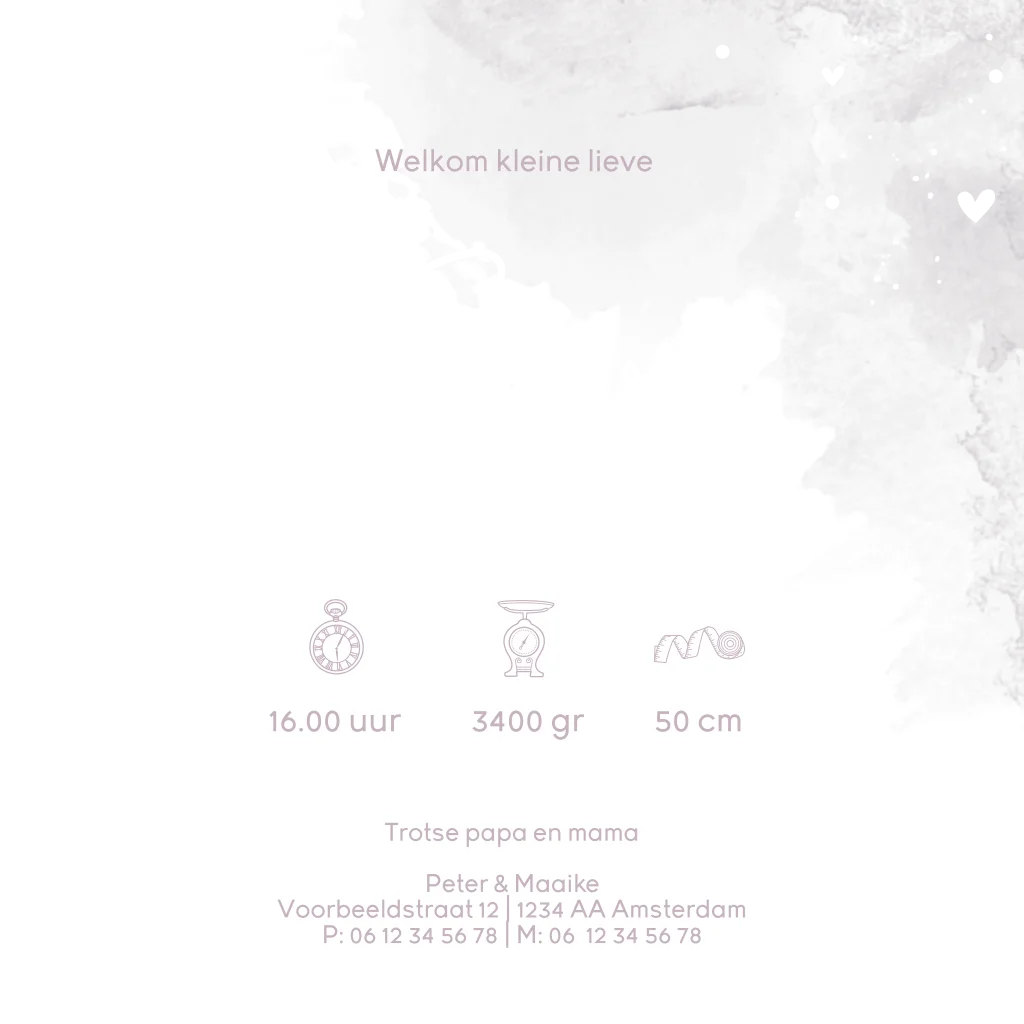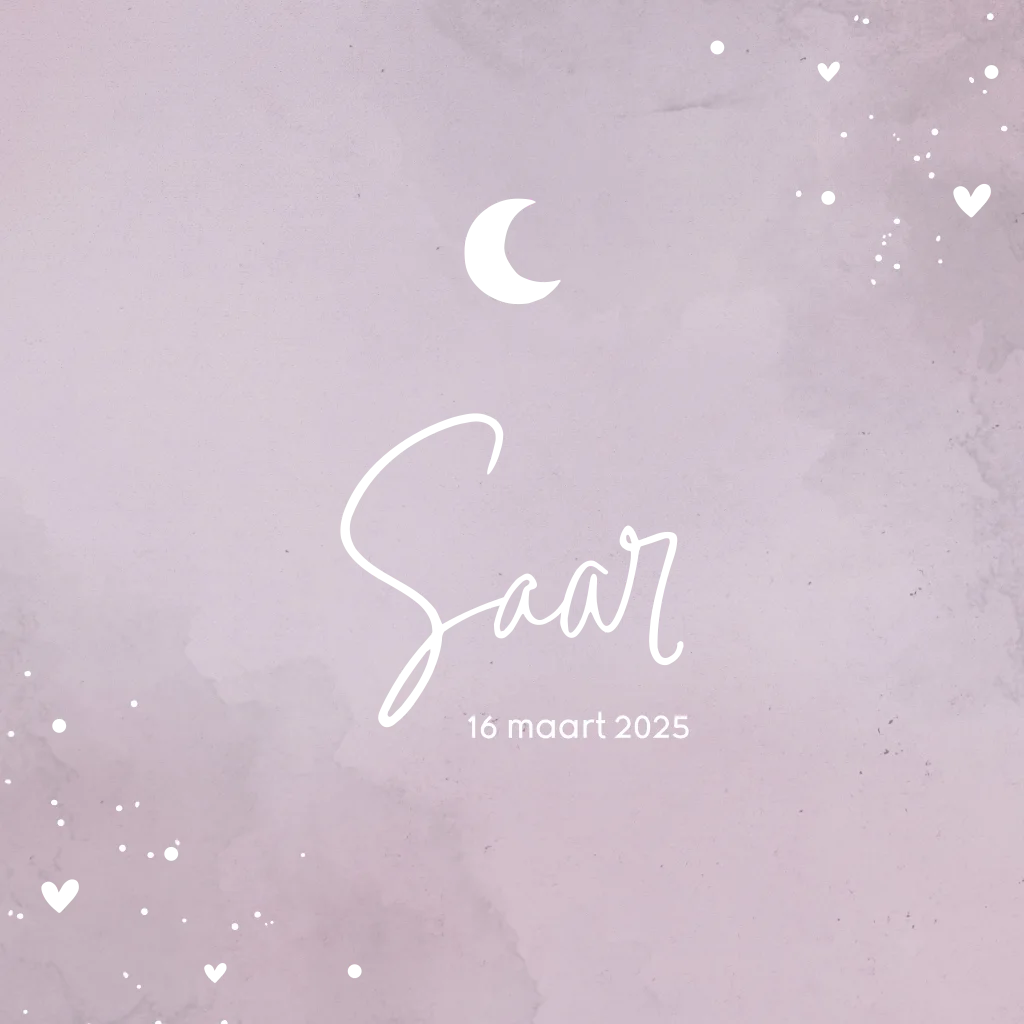 Een hip lila geboortekaartje met verschillende roségoudfolie elementen. Maak het kaartje helemaal naar wens in onze online editor.
