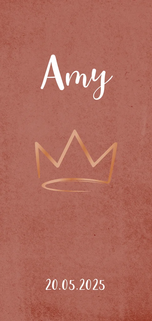 Minimalistisch geboortekaartje voor een meisje met kroon in hoogglans, beton-look achtergrond en in de trendkleur terra. Maak dit kaartje helemaal af in de online editor voor een origineel resultaat.