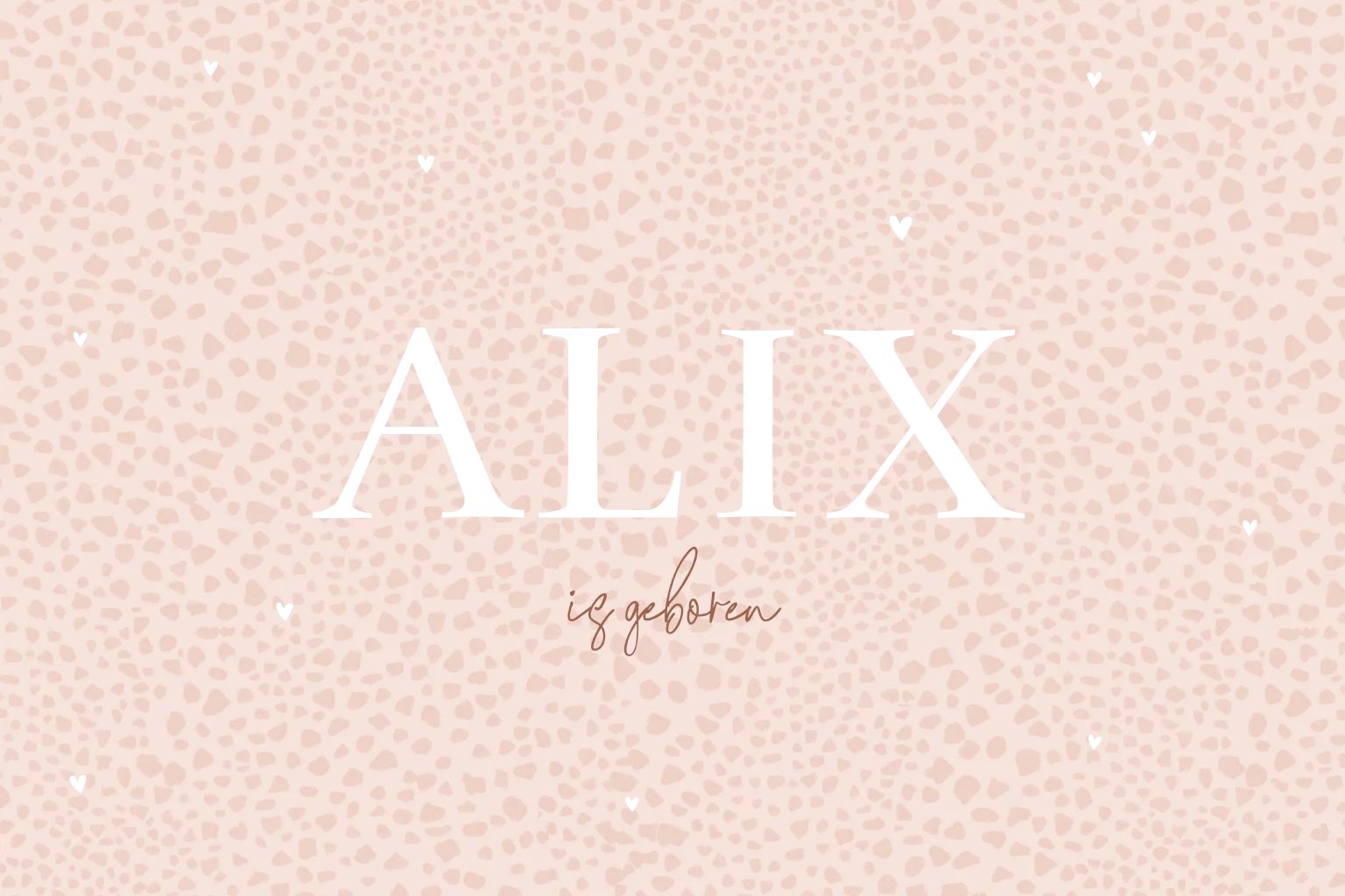 Wat een hip ontwerp voor de geboorte van jullie dochtertje. De achtergrond heeft een dierenprint en zachte kleuren. De naam trekt meteen de aandacht in het luxueuze roségoudfolie. Ook zijn er wat lieve hartjes toegevoegd.
