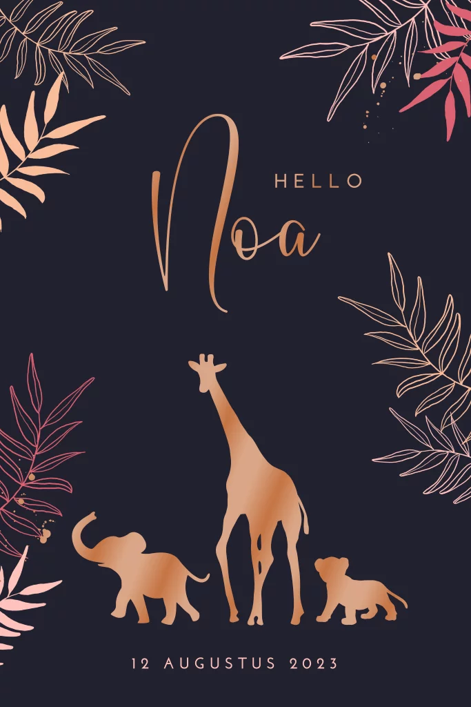 Een lief en avontuurlijk geboortekaartje voor jullie kleine meid. De achtergrond heeft een mooie donkere kleur. Hierop zijn verschillende stijlvolle takken met bladeren te zien. De jungledieren worden, net als de naam, in luxe hoogglans gedrukt.