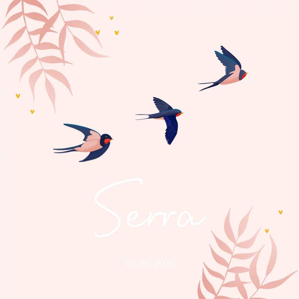 Een ontzettend lief babykaartje voor jullie kleine dochtertje. De achtergrond is lichtroze en heeft wat stijlvolle bladeren in de hoeken. In het midden zijn prachtige vliegende zwaluwen weergegeven. Het roségoudfolie aan binnen- en buitenzijde maakt het helemaal af.