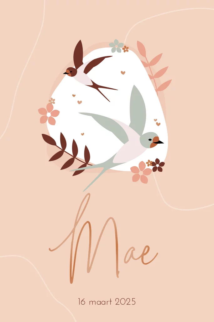 Een geboortekaartje voor jullie dochter waar veel op te zien is. De twee vogels in het midden worden uitgelicht door een wit vlak, waar mooie bloemen en bladeren bij zijn toegevoegd. De achtergrond heeft een perzik kleur en er zijn wat subtiele witte lijnen toegevoegd. Het hoogglans aan zowel de binnen- als de buitenzijde zorgen voor een luxe afwerking.