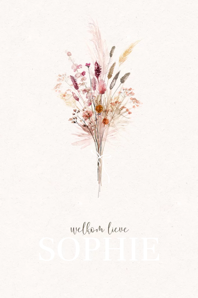 Roségoudfolie geboortekaartje voor meisje met droogbloemen op kartonlook