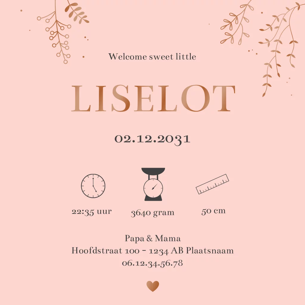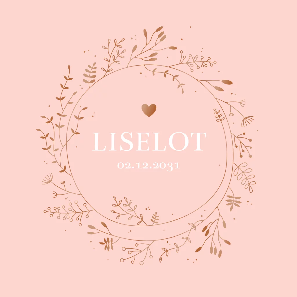 Hip hoogglans geboortekaartje voor meisje met botanische bladerkrans