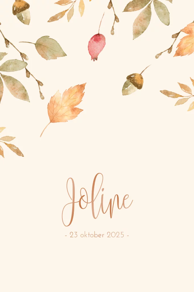 Trendy herfst geboortekaartje voor de geboorte van je dochtertje met hippe waterverf herfstbladeren en eikels.