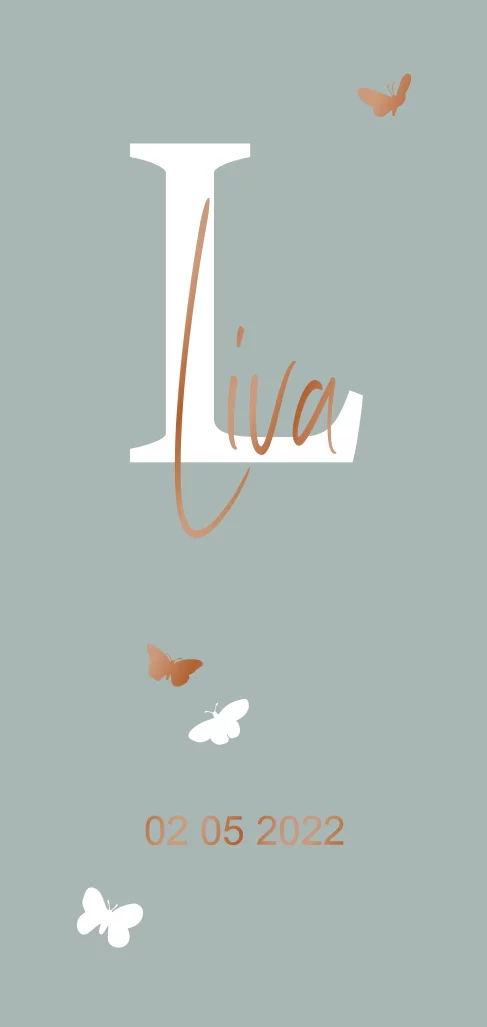 Hip hoogglans geboortekaartje voor meisje met initiaal en vlindertjes