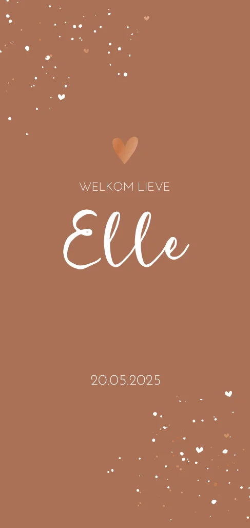 Trendy roestbruin geboortekaartje voor meisje met hoogglans hartje