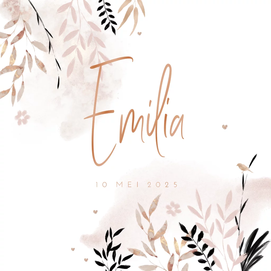 Trendy hoogglans geboortekaartje voor meisje met stijlvolle takjes, bloemetjes en vogeltjes in oudroze tinten.