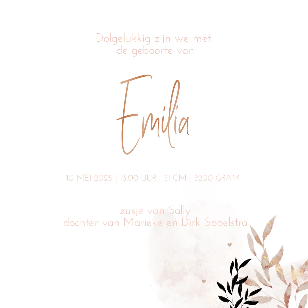 Stijlvol hoogglans geboortekaartje voor meisje met natuurlijke takjes
