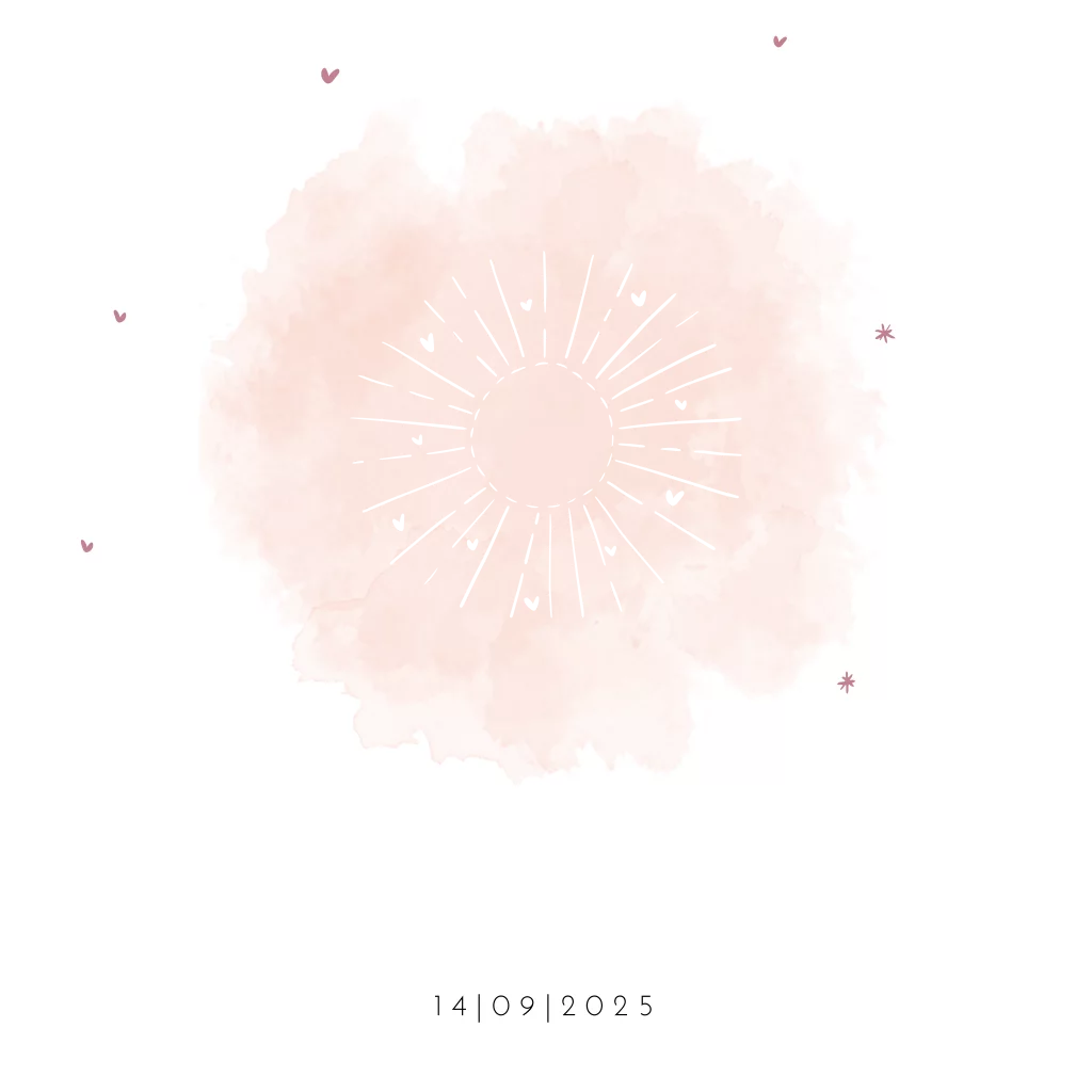 Stoer geboortekaartje met roze waterverf en rosegoudfolie zon