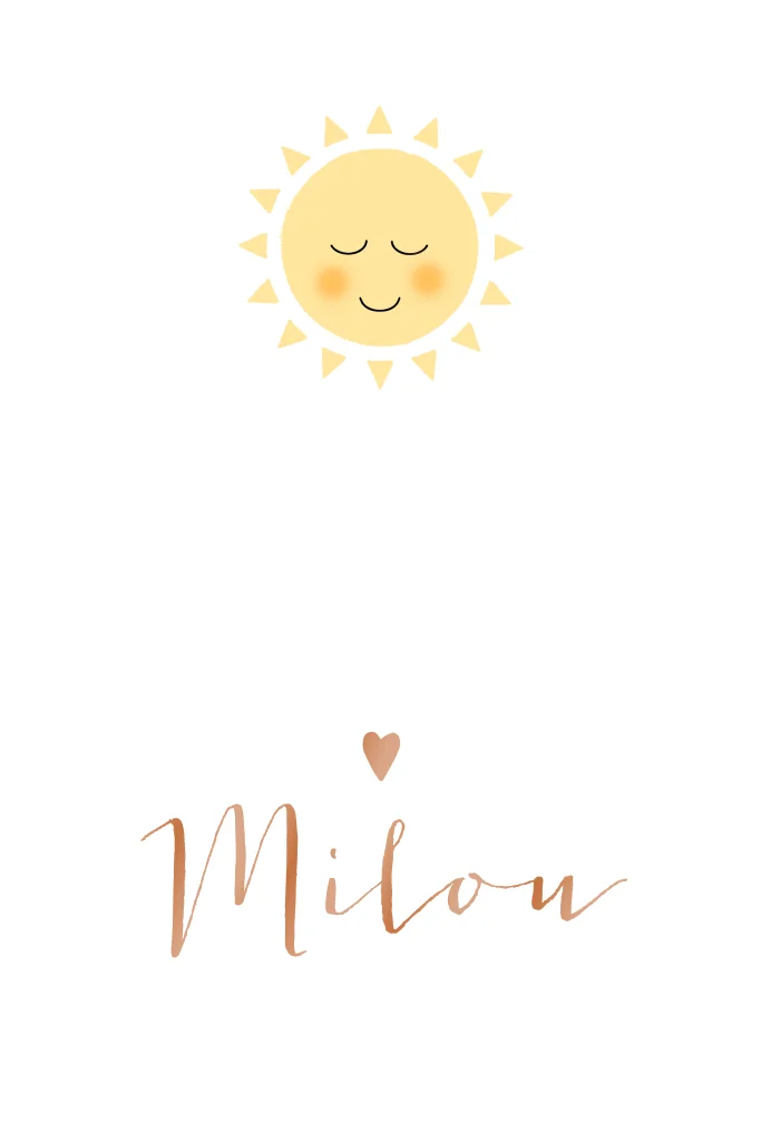 Minimalistisch geboortekaartje voor je dochter met een vrolijke illustratie van een zon en de babynaam in hoogglans. Wijzig zelf de achtergrondkleur en maak een uniek geboortekaartje!