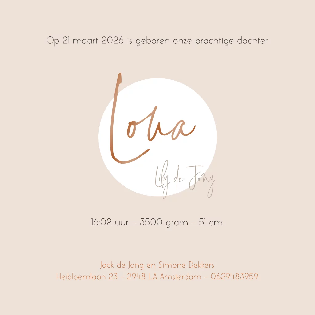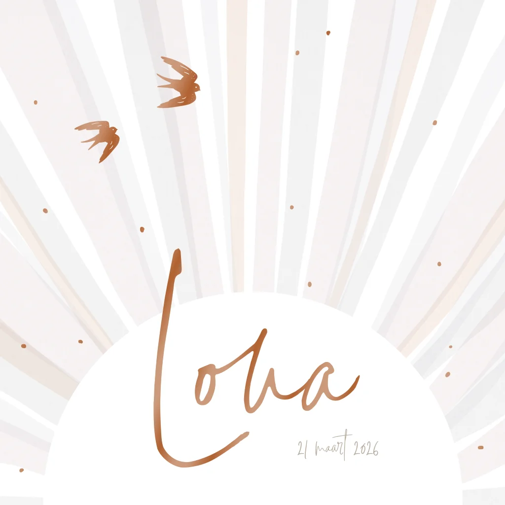 Stijlvol babykaartje met zonnestralen en vliegende zwaluwen. De naam van jullie dochter staat echt in het zonnetje met sierlijke letters en in hoogglans. Ook de vogels worden gedrukt in folie. Pas de foliekleur en achtergrond naar wens aan in de online editor.