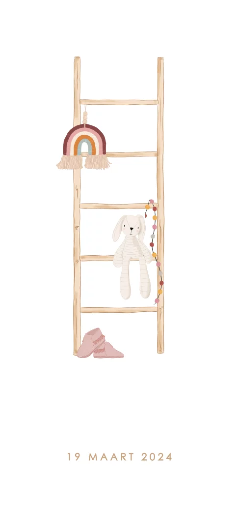 Op zoek naar een uniek geboortekaartje voor de geboorte van je dochter? Op dit lieve kaartje staat de mooi illustratie van een ladder en andere accessoires uit de kinderkamer. Een knuffel konijn, regenboog hanger en roze schoentjes. De naam van je dochtertje wordt gedrukt in rosegoudfolie en maakt dit kaartje extra bijzonder!